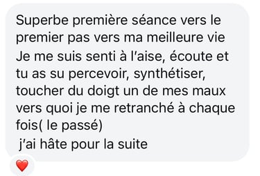 🇬🇧 superb first session of the First step towards your best life. I felt at ease, listened to and you were able to perceive, synthesize, touch on one of my pains to which I retreat each time (the past)