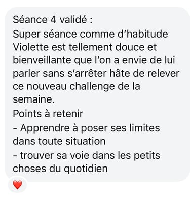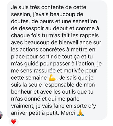 🇬🇧 I am very happy with this session, I had a lot of doubts, fears and a feeling of despair at the beginning and as always you reminded me with great kindness about the concrete actions to put in place to get out of all this and you guided me to take action, I feel reassured and motivated for this week 💪 I know that I am the only one responsible for my happiness and with the tools that you gave me and which really speak to me, I will make sure to get there little by little. thank you 🙏