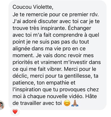 🇬🇧 hi Violette, thank you for this first meeting. I loved chatting with you because I find you very inspiring. chatting with you made me understand how much I am not at all aligned in my professional life at the moment. so I will review my priorities and really invest myself in what makes me vibrate. thank you for the trigger, thank you for your kindness, your patience, your empathy, and the inspiration that you provoke in me with each new video. looking forward to working with you 😊🙏🏽